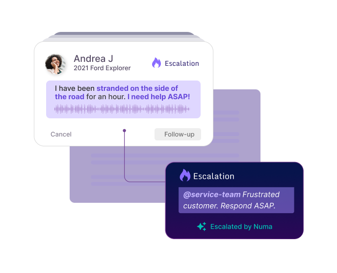 Instantly detect "Heat Cases". Numa’s always-on AI analyzes the sentiment of every call and text, alerting you to upset customers in real time so you can proactively save the relationship and your CSI.